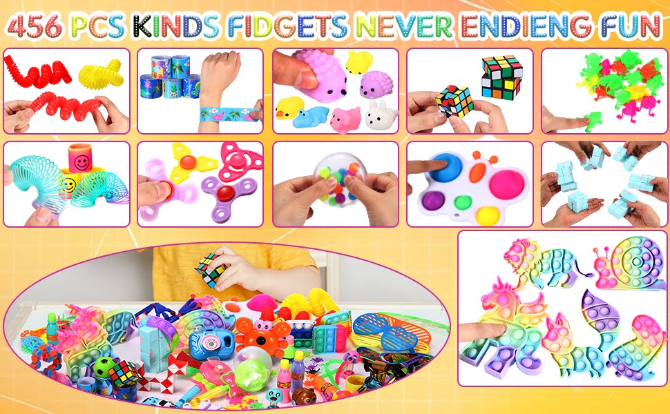 This party assortment toys includes 52 kinds of funny fidget toys, such as 5 Animal pop fidget keychains (lions, dinosaurs, foxes, horses, and snails), 14 mini pop fidget keychains (square, vertical and animals), 2 pop bracelet keychains, 30 spiders, 4 wall climbing spiderman, 2 cameras, 5 tumblers, 4 smiley faces, 1 magic stress cube, 2 lollipop whistles, 6 squishies, 8 colored balls, 2 wacky tracks, 1 rebounding kart, 2 tubes, 20 jumping frogs, 4 rainbow circles, 1 assembled ball, 70 paperclips, 4 touching hands, 3 assembled dinosaurs, 8 dinosaurs, 2 glasses, 40 monkey building blocks, 1 football, 5 blowing dragons, 5 slap bracelets, 5 coke pens, 3 three-finger gyroscopes, 2 hand football rackets, 5 rings, 5 jewel rings, 2 marble and mesh, 2 gold rings and silver rings.