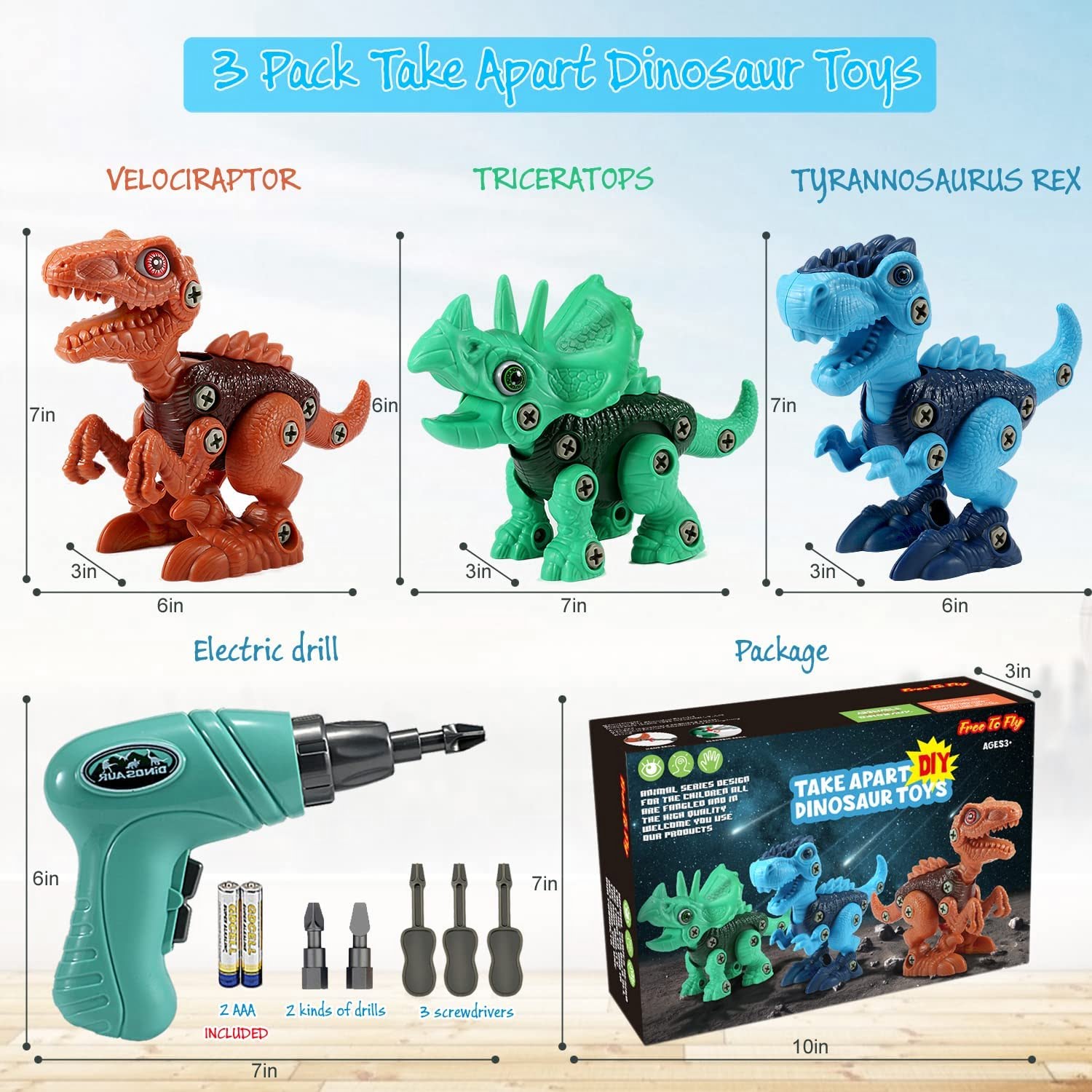 ● Color: Blue Tyrannosaurus Rex, Green Triceratops & Brown Velociraptor
